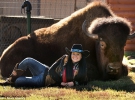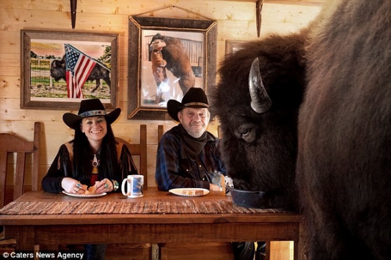 Американская пара Ронни и Шеррон Бриджес из Техаса сделали бизона домашним животным по прозвищу Дикарь. У него есть своя комната для просмотра любимых фильмов. Завтракает за столом вместе с хозяевами. Десять лет назад бизон был шафером на свадьбе семьи Бриджес.