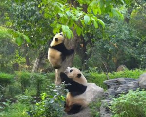 Панде очень не понравилось, что ее детеныш расшалился и залез на дерево. Мать попыталась стащить свое чадо вниз, и через некоторое время маленькая панда упала на землю.