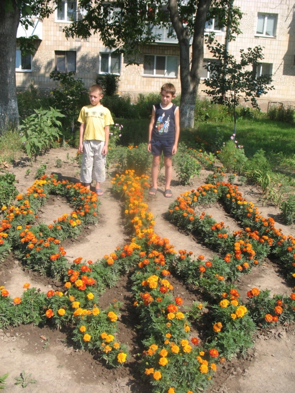 "Может, флаг цветами выложу. Но с синими цветами это проблематично - они быстрее отцветают. Вот с бархатцами хорошо - одни сохнут, другие расцветают и тризубец постоянно свежий. Я планировала, что он будет полностью желтый, но насеялось немного и оранжевых цветов. Когда зацвели, немного расстроилась, что не так, как я планировала. Но потом увидела, что все равно красиво получилось и всем нравится ".