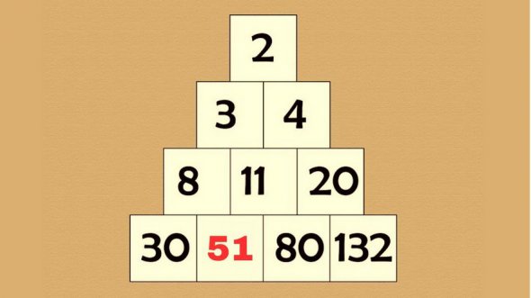 Подумайте о числах в пирамиде как о последовательности: 2, 3, 4, 8, 11, 20, 30, ? , 80, 132.