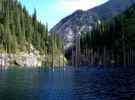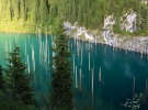 Озеро Каинды похоже на захоронение древних суден - как мачты затонувших кораблей из бирюзовой глади озера торчат острые пики. В 1911 году в этой местности произошло землетрясение, оползень, возникший в результате катаклизма, перекрыл реку, и долина перед этим препятствием наполнилась водой. Так и образовалось загадочное озеро Каинды в высокогорье Казахстана.