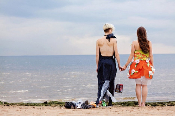 Акция включала в себя не только генеральную уборку побережья. Одновременно на пляже происходил экологический перформанс: дизайнеры создали два платья из мусора, и модели примерили их на себя.