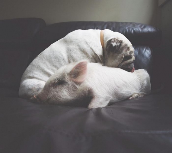 "Знакомьтесь с поросенком Оливером. Он считает себя щенком !, - сказала владелица животного Алиса. - Он каждый час дня с собаками. Играет и спит рядом с ними. Если собаки бегут к воротам лаять на что-то, Оливер бежит вместе с ними."