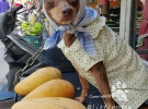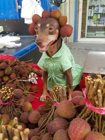 Таким образом владелец Сяо Пи пытается привлечь внимание к своей продукции. Мужчина торгует овощами и фруктами на местном рынке в провинции Тайвань. Кроме аксессуаров собаку одевают в различные костюмы.