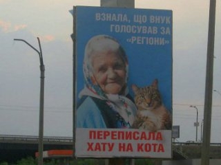 Шестым стал популярный в Украине мем "Дом на кота". Он появился в сети незадолго до появления известного билборда в Днепропетровске, на котором была изображена бабушка с котом и надпись "Узнала, что внук голосовал за" Регионы "- переписала дом на кота". Мем очень быстро распространился в интернет-пространстве, несмотря на то, что билборд просуществовал недолго.