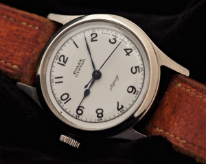 Отметим, часы представляют собой абсолютный раритет - корпус из нержавеющей стали, центральные минутная, часовая и секундная стрелки, циферблат покрыт белой эмалью, арабские цифры.