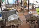 В центре несколько тачек, в них нечищеный арахис. Рядом пожилая женщина по клетчатых пакетиках раскладывает непонятную белую массу. Присматриваюсь - это сыр из козьего молока. Он лежит в большой миске с длинной ступкой. Продавщица ею вымешивает этот сыр. Весов нет, фасует на глаз.