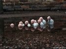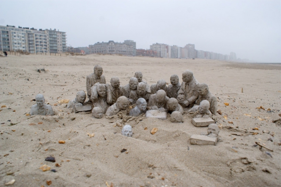 Для инсталляции художник использовал всего несколько человеческих фигурок высотой не более 25 сантиметров, при этом расположены они так, что кажутся настоящими полноразмерными копиями людей.