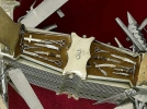 Все эти приспособления прячутся в рукоятке из черепашьего панциря. Многим может показаться странным, но в этом многофункциональном ноже в отличие от его современных аналогов, нет открывалки дл бутылок. Дело в том, что бутылочная пробка, какой мы ее знаем сегодня, была изобретена только в 1892 году. А экспонат был произведен в Германии в 1880 году фирмой Holler & Co специально для одного из нью-йоркских магазинов. Он появился на 11 лет раньше швейцарского армейского ножа.