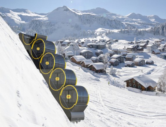 Новый фуникулер курсирует из города Швиц, расположенного в долине, на высокогорный климатический курорт Штоос. Этот проект обошелся стране в 44,6 миллиона евро. Но этот фуникулер - вершина швейцарского дизайна, как утверждают разработчики.