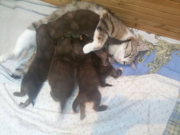 Для волчат новой матерью стала наша кошка Муська. Она уже выкормила рыси. Кошка хоть и имела своего ребенка хорошо приняла волчат. Сразу начала их кормить, греть и всячески заботиться.