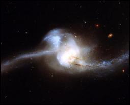 Пример того, что может выйти на промежуточном этапе слияния, показывает объект NGC2623, или Arp 243, расположенный примерно в 250 миллионов световых лет от Земли в направлении созвездия Рака.
