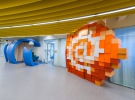 Миниатюрные иконки, выросшие до исполинских размеров разбиваются на объемные пиксели, вырастающие из стен. Во всех офисах Яндекса можно писать на стенах, они покрыты специальной пленкой.