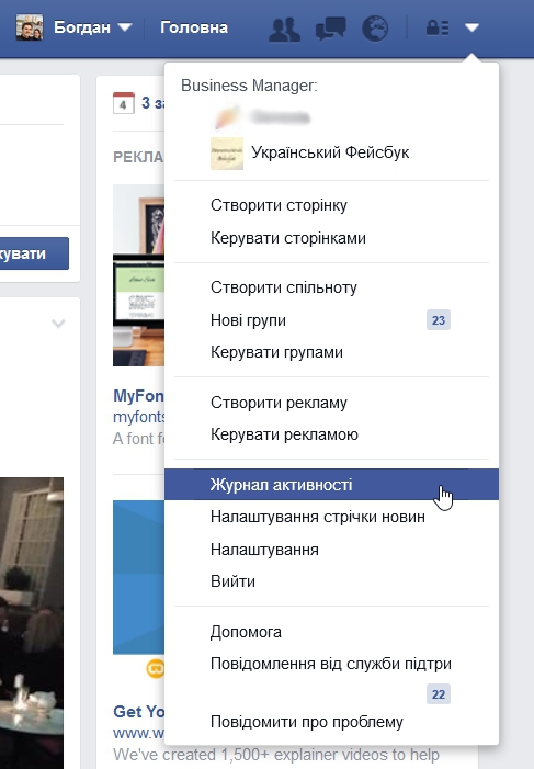 В Facebook также можно просмотреть все ваши предпочтения, комментарии и заметки. Если захотелось пройтись по уголкам памяти нажмите на стрелочку в правом верхнем углу и выберите Журнал активности.