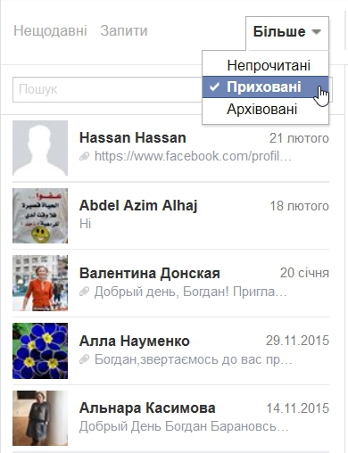 У пользователей есть сообщения, о которых даже и не подозревает . В Facebook есть две папки для входящих сообщений. Сообщение с основной, которую вы всегда видите, и вторая предназначена для сообщений Facebook по тем или иным причинам скрыл. Чтобы их прочитать, откройте Сообщения ➡ Больше ➡ Скрытые.