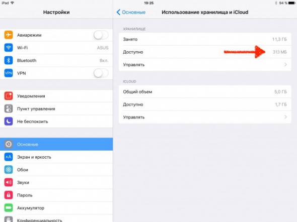 1. Заходим в "Настройки" → "Основные" → "Использование хранилища iCloud" и проверяем количество свободного места.