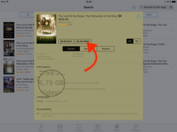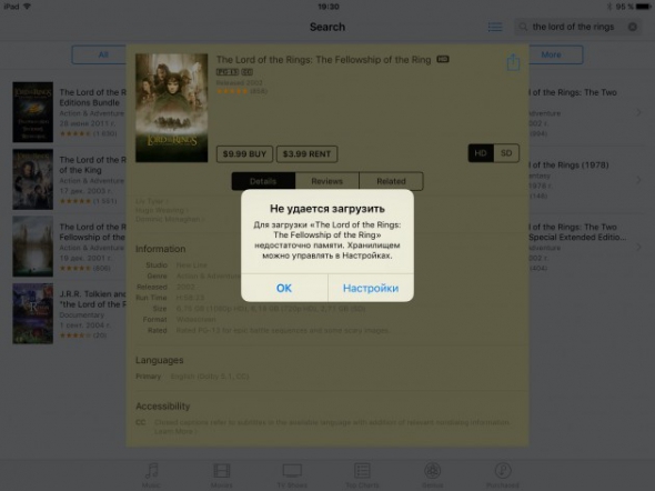 3. Убеждаемся, что выбранный фильм имеет гораздо больший объем, чем количество свободного места на гаджете, нажимаем на "Прокат". На самом деле, покупать ничего не нужно. Деньги со счета могут списаться только в том случае, если у вас есть достаточная сумма и хватает свободного места.