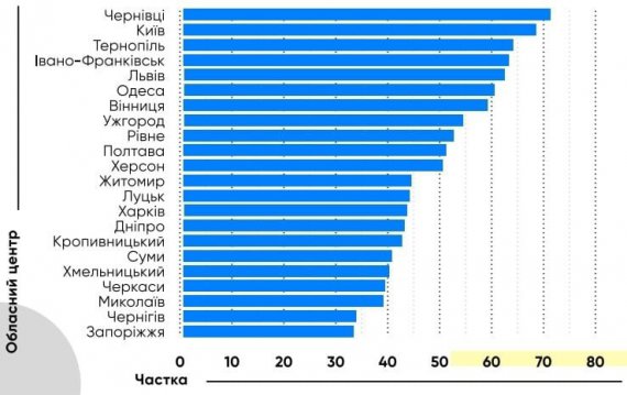 Самая большая доля пользователей зафиксирована в Черновцах - 71,51%. Лидируют также Киев - 68,15% и Тернополь - 64,02%. Наименьший процент лиц, которые "сидят" в соцсети есть в Николаеве - 39,07%, Чернигове - 33,86% и Запорожье - 33,53%.