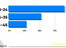 По возрасту, самая большая доля украинских Instagram-пользователей приходится на возрастную группу 25-35 лет - 4 млн человек. Однако в этой группе находится лишь 54,29% от общего числа жителей страны.