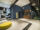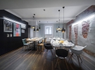 Большая часть мебели и предметов декора отличается фактурной отделкой ореховым шпоном, которая контрастирует с глянцевыми и матовыми поверхностями. Темные и яркие краски сочетаются с белыми стенами и полами, а кирпичная кладка и голый бетон напоминают об индустриальном прошлом здания.
