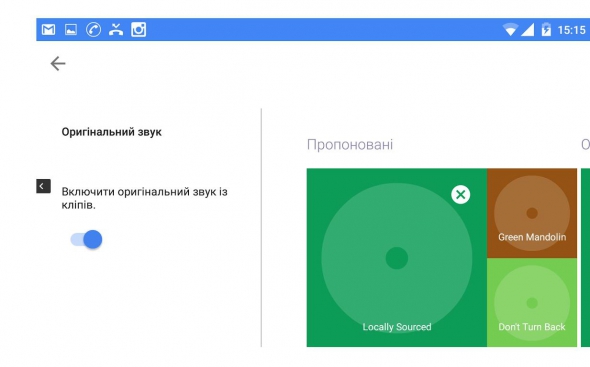 Предлагается транслировать или убрать оригинальный звук видео. А для саундтрека под рукой целая подборка инструментальных композиций различных жанров: