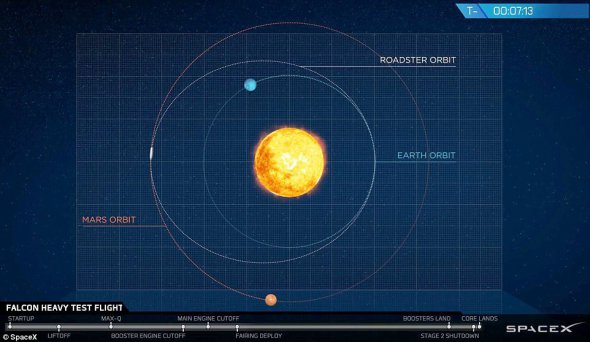 Электромобиль Tesla Roadster уже покинул орбиту Марса и движется к Пояса астероидов.