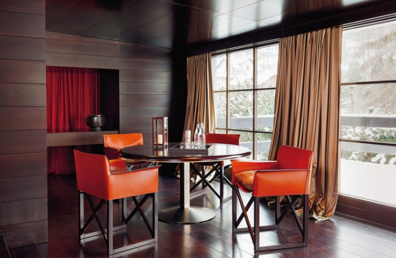 "Я люблю восточный стиль за его чистоту, четкость линий, строгость форм и исключительное внимание к деталям", – говорит Армани, который часто использует ориентальные мотивы и в своих коллекциях одежды, и в мебельной линии. Интерьер, созданный модельером и его командой, доказывает, что вся эта экзотика уместна даже в таком неожиданном месте, как Энгадин.
