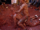 Люди хватали помидоры и кидали их во все стороны, окрасив все вокруг в красный цвет за несколько минут.