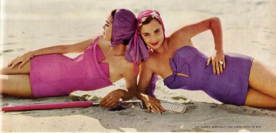 На советском пространстве вплоть до 60-х было трудно с купальниками для девушек. Они в 50-60-70-е шили купальники сами, из ситца, сатина и из того, что могли достать. В журналах были выкройки и инструкции. Использовали также старые трикотажные платья и кофточки - в общем, все, что годилось.