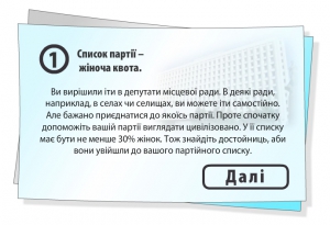 Игра разработана в простом формате "экшн". Игроку предлагается роль кандидата в депутаты местного совета. Каждый уровень изображает или норму из закона, или одну из особенностей предвыборной кампании этого года. Игрок в зависимости от уровня или должен набрать женщин в свой список, или "слить" компромат на однопартийца, или успеть выкупить рекламные площади у конкурентов, - сообщают создатели игры.