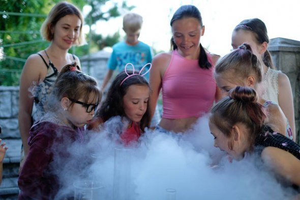 Оксана Русанова развивает проект в трех направлениях. Вместе с командой проводит шоу с яркими физическими и химическими опытами на детских праздниках, организовывает детские научные семинары и семейные лагеря.