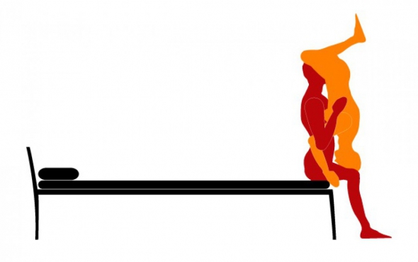 Это поза 69, только сидя. Тут изощриться снова придется партнерше, причем довольно сурово. Нужно принять стойку на голове. А еще нужно держать равновесие и пытаться получить удовольствие от того, что в этот момент делает партнер.