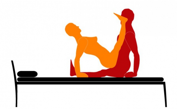 На первый взгляд ничего особо сложного в ней нет: мужчина принимает позу "кресла", а женщина садится на него сверху, закидывая при этом ноги ему на плечи. Сложность состоит в том, что опираться придется на руки, и при этом нужно как-то двигать тазом, иначе это не секс вовсе.