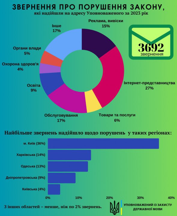 "Города-миллионники - Киев, Харьков, Одесса - остаются лидерами по количеству обращений о нарушении языковых прав граждан. В столице в 2023 году граждане зафиксировали в более чем в полтора раза больше нарушений, чем в 2022 году и в три раза больше, чем в 2021-м", - сообщил Кримень.