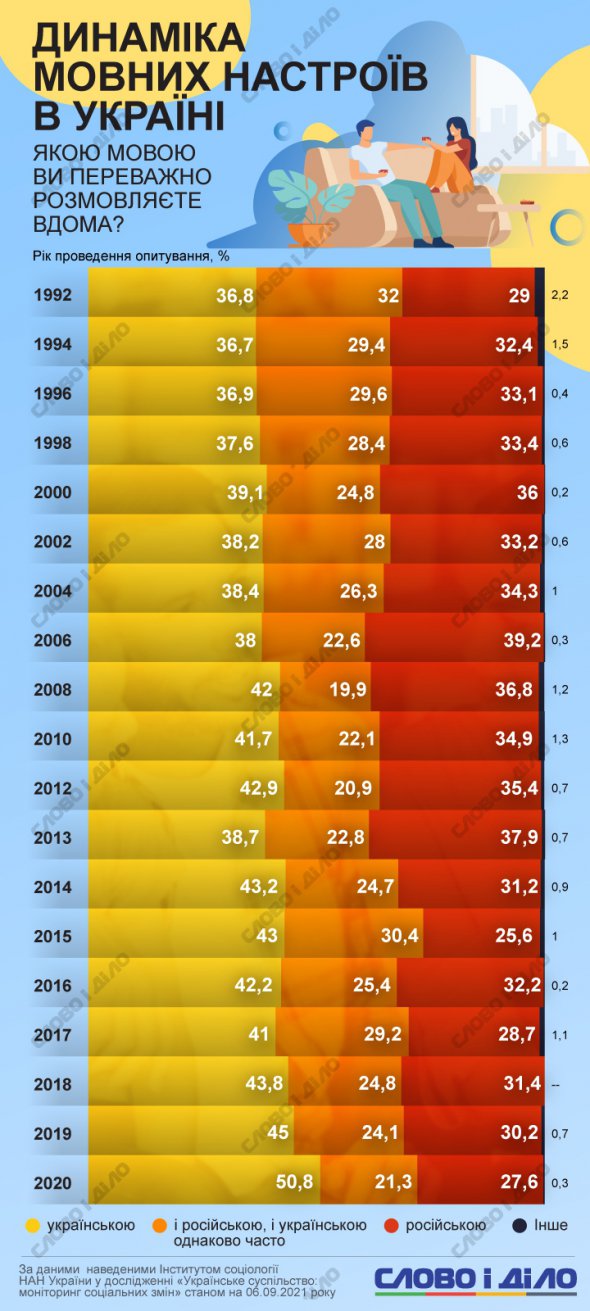 После 1991 года вырос процент общающихся на украинском языке в быту - с 36,8% до 50,8%. В 2020-м на русском в быту общалось 27,6% населения. Оба языка использовали 21,3%.