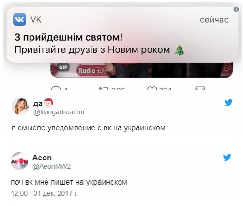 Соцсеть "ВКонтакте" разослала пользователям из России новогодние поздравления на украинском языке.