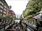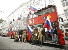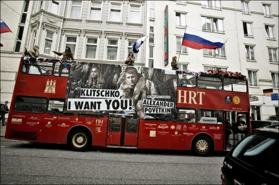 Большой двухэтажный автобус с 25-ю моделями, одетыми в армейскую униформу, прибыл к месту проведения пресс-конференции Владимира Кличко, посвященной его поединку против обязательного претендента на титул WBO Тони Томпсона.