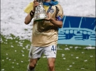 Тимощук передает Кубок УЕФА в руки президента России Дмитрия Медведева. Трофей весит 15 кг и изготовленный из чистого серебра.
