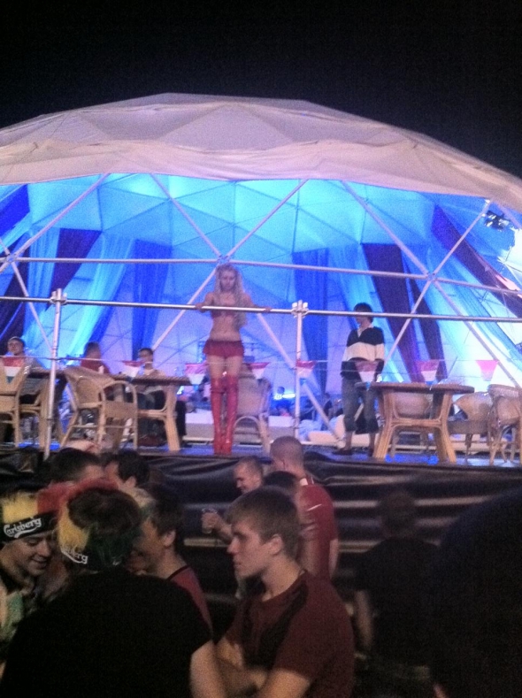 После завершения матч Германия-Португалия, на территории фан-зоны в Харькове футбольных фанатов начали призывать к другому развлечению. На территории вип-площадки начали призывно танцевать молодые девушки в минималистичных бикини. Четыре девушки вышли на край площадки, чтобы их было видно со всей зоны, сообщает корреспондент Gazeta.ua
