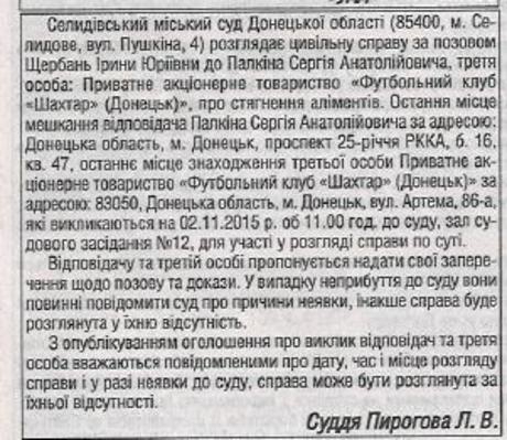 Поскольку и Палкин, и сам "Шахтер" ныне кочуют по всей Украине, а последним местом их "прописки" значится Донецк, то суд вынужден разыскивать их посредством размещения соответствующего объявления в правительственной газете.