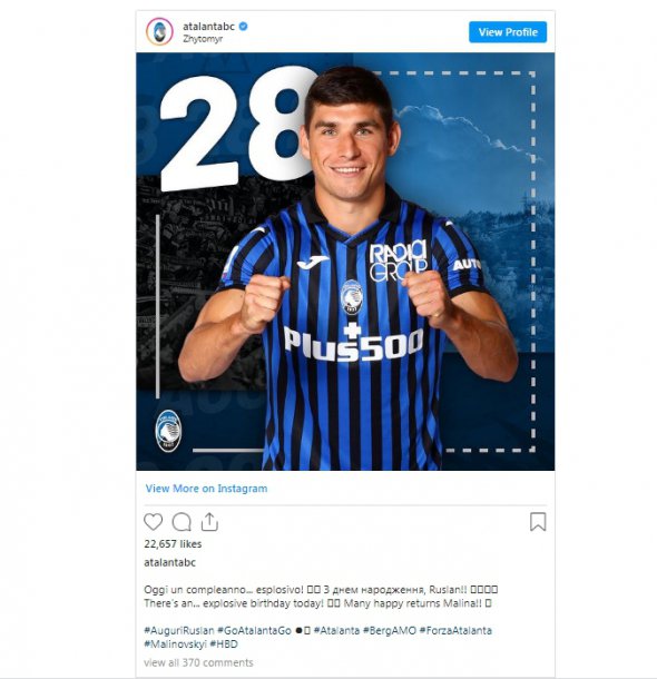 Футбольная команда "Аталанта" на украинском языке поздравила полузащитника Руслана Малиновского с днем рождения
