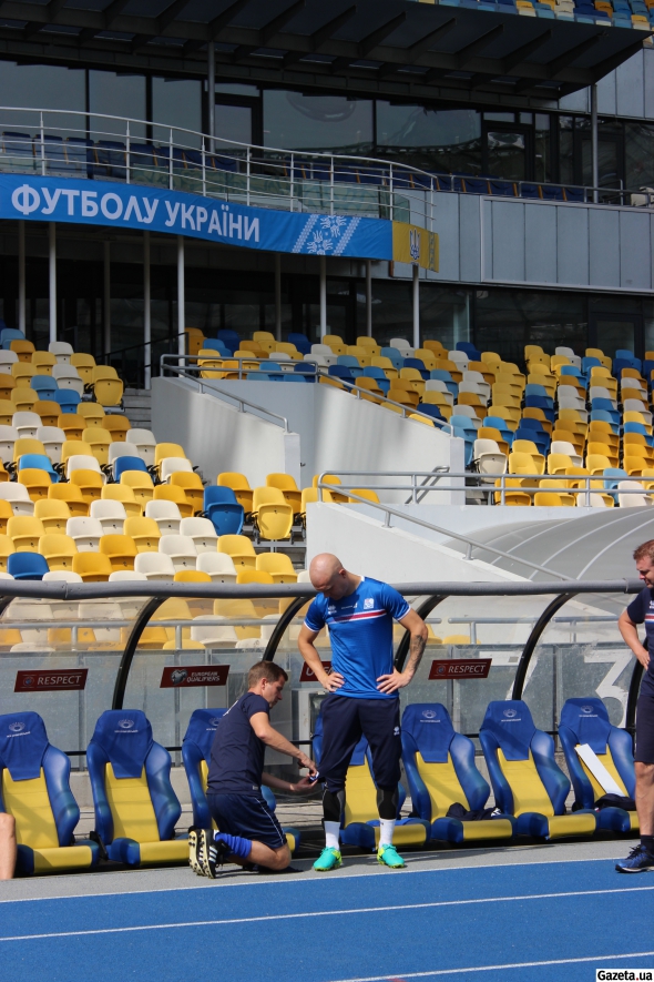 Интересный эпизод произошел с одним из игроков сборной Исландии. Кто-то из персонала подрезал штаны Эмилю Хальдфредссону на уровне колен и превратил их в шорты. Еще несколько футболистов прибегли к такому же методу. Очевидно, гости не ожидали, что в Киеве будет так жарко. Сегодня в столице Украины +25 С.