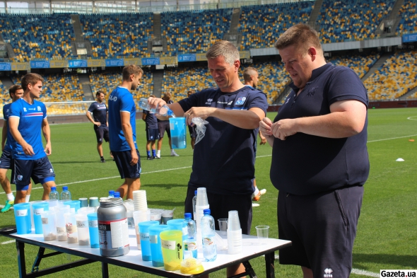 Еще одна особенность тренировки сборной Исландии - вот такие коктейли для футболистов. Каждый сосуд подписано номером игрока. Персонал точно знает, кому какая порция принадлежит.