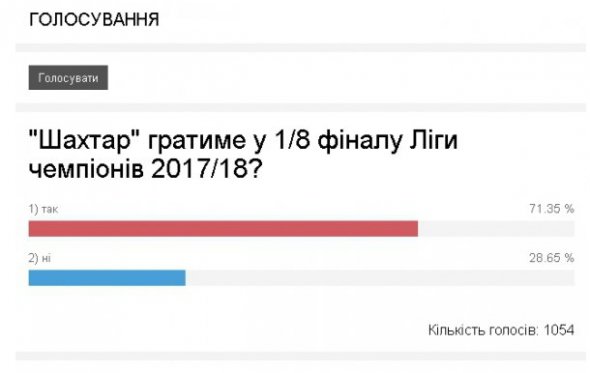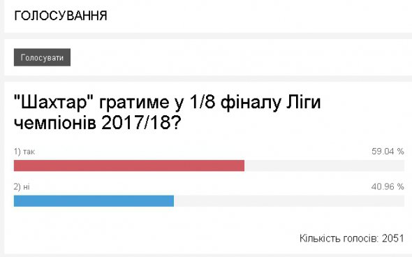 На нашем сайте продолжается опрос среди читателей, верят ли они в то, что "Шахтер" будет играть в 1/8 финала Лиги чемпионов. Около 60% респондентов, проголосовавших считают, что да. Чуть более 40% имеют противоположное мнение.