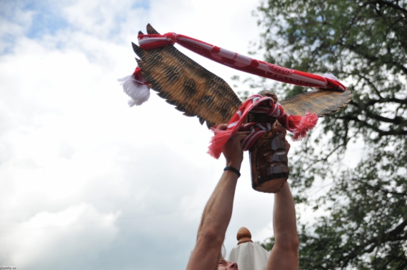 Фанаты обмотали орла шарфами своей сборной. Носят его на вытянутых вверх руках. Когда садятся пить пиво, орла заставляют бокалами.