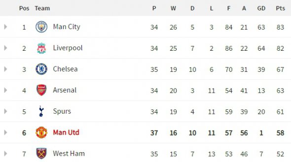 В турнирной таблице "Манчестер Юнайтед" имеет 58 очков после 37-ми поединков. Теоретические шансы на попадание в топ-четверку потеряны.