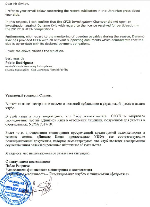 "Динамо" ссылается на письмо из УЕФА от руководителя финансового мониторинга и соответствия Пабло Родригеса на имя первого вице-президента клуба Виталия Сивкова.