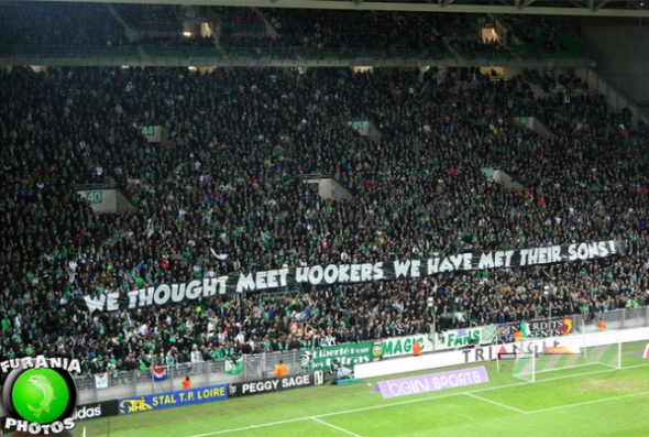 Во время матча чемпионата Франции с "Эвианом" на фан-секторе "зеленых" появилась растяжка с надписью "We thought meet hookers. We have met their sons" ("Мы хотели снять проституток, а встретили их сыновей").