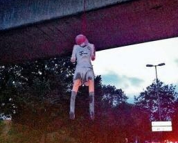 Болельщики футбольного клуба "Шальке" из Гельзенкирхена повесили на мосту чучело вратаря мюнхенской "Баварии" и сборной Германии Мануэля Нойера.