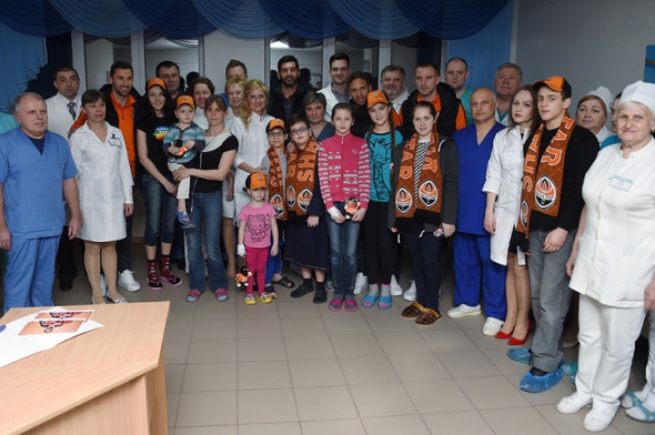 После небольшой экскурсии по больнице футболисты и главный тренер зашли в палаты к детям. Маленькие пациенты получили в подарок мягкие игрушки, шарфы, кепки.